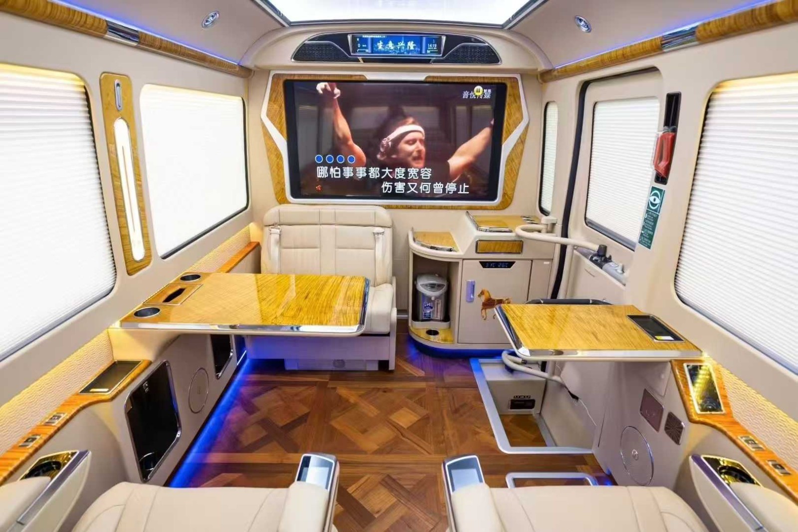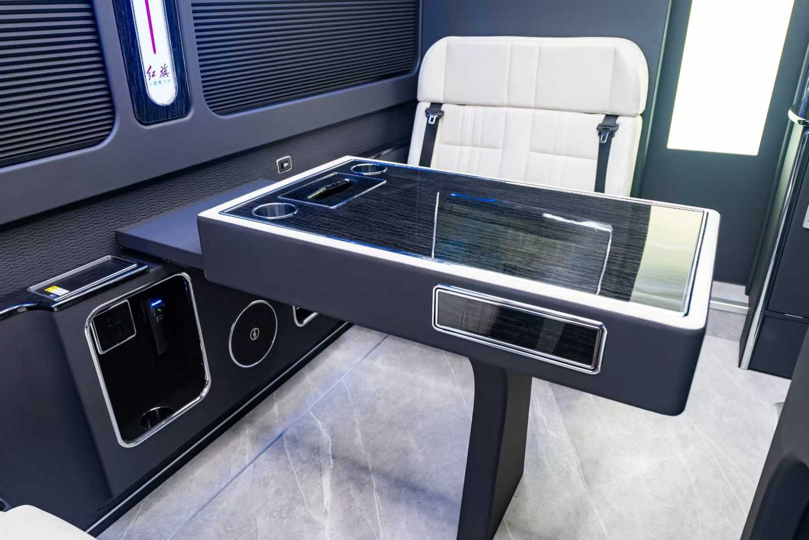 顶配旗舰版相比豪华版增加驾驶位手动腰托、乘客区侧窗声学玻璃、办公桌、秘书桌、车载冰箱、隐藏式雨伞架、空气净化器、负离子发生器、单层地毯、可拆洗脚垫等。
